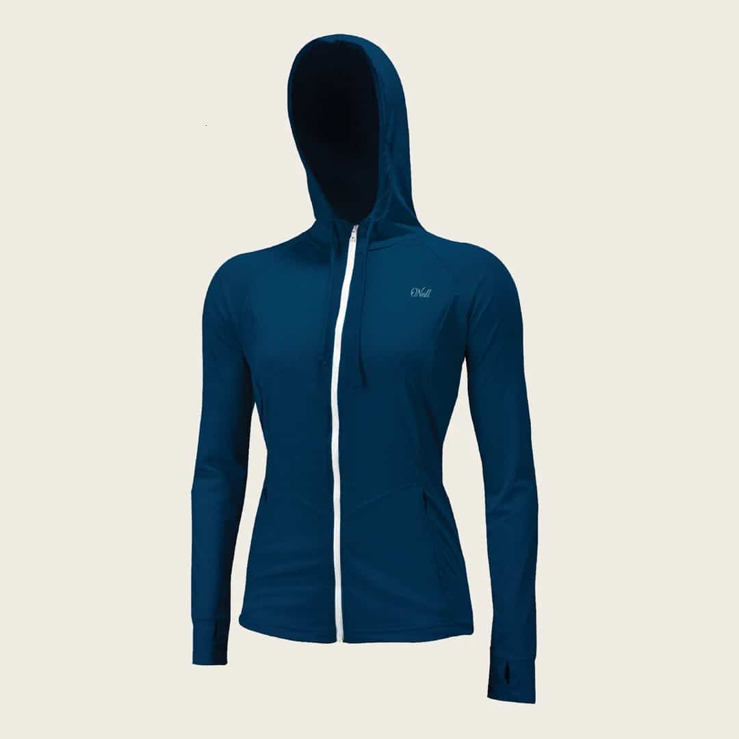 חולצת לייקרה עם שרוול ארוך, רוכסן וכובע לנשים להגנה על העור מפני קרני UV פריחה ושפשפות,