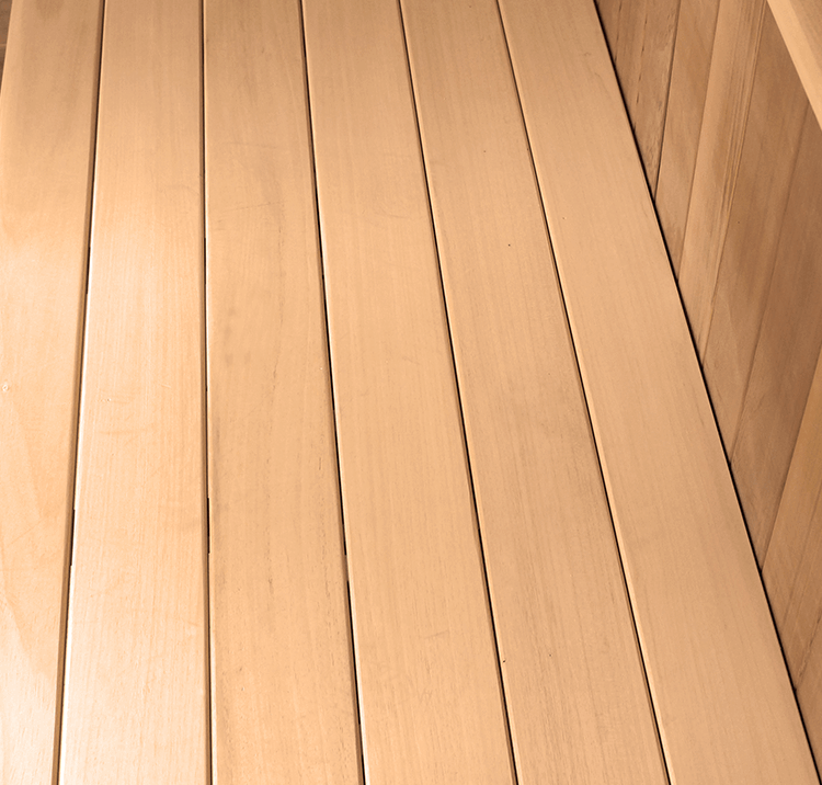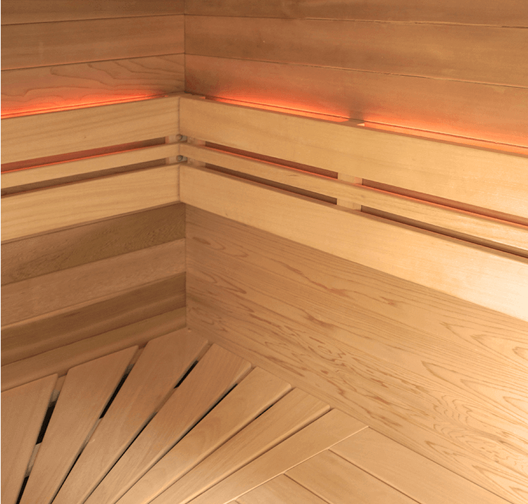 הסאונה בנויה מעץ המלוק (Hemlock) וארז אדום קנדי, המבטיחים עמידות ומראה יוקרתי. הפנים עשוי מעץ אבאצ'י, הידוע במוליכות תרמית נמוכה, המעניק נוחות מרבית למשתמשים. הסאונה מצוידת בתאורת LED לכרומותרפיה, הממוקמת באזור משענות הראש, ליצירת אווירה מרגיעה ומותאמת אישית.