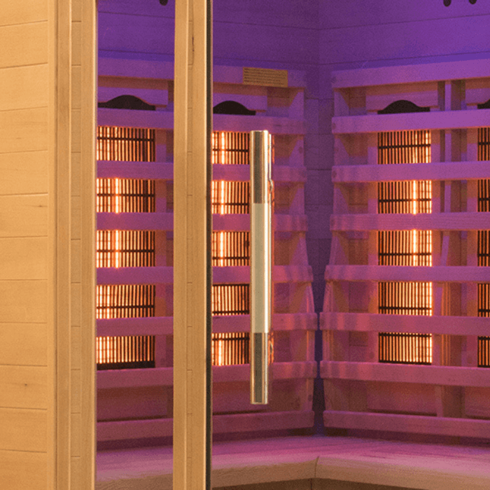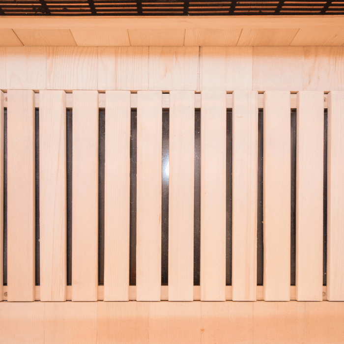 הסאונה בנויה מעץ אשוח קנדי איכותי, המבטיח עמידות לאורך זמן ומעניק מראה טבעי וחם. דלת הזכוכית המחוסמת בעובי 8 מ"מ מספקת ביטחון ותחושת פתיחות.